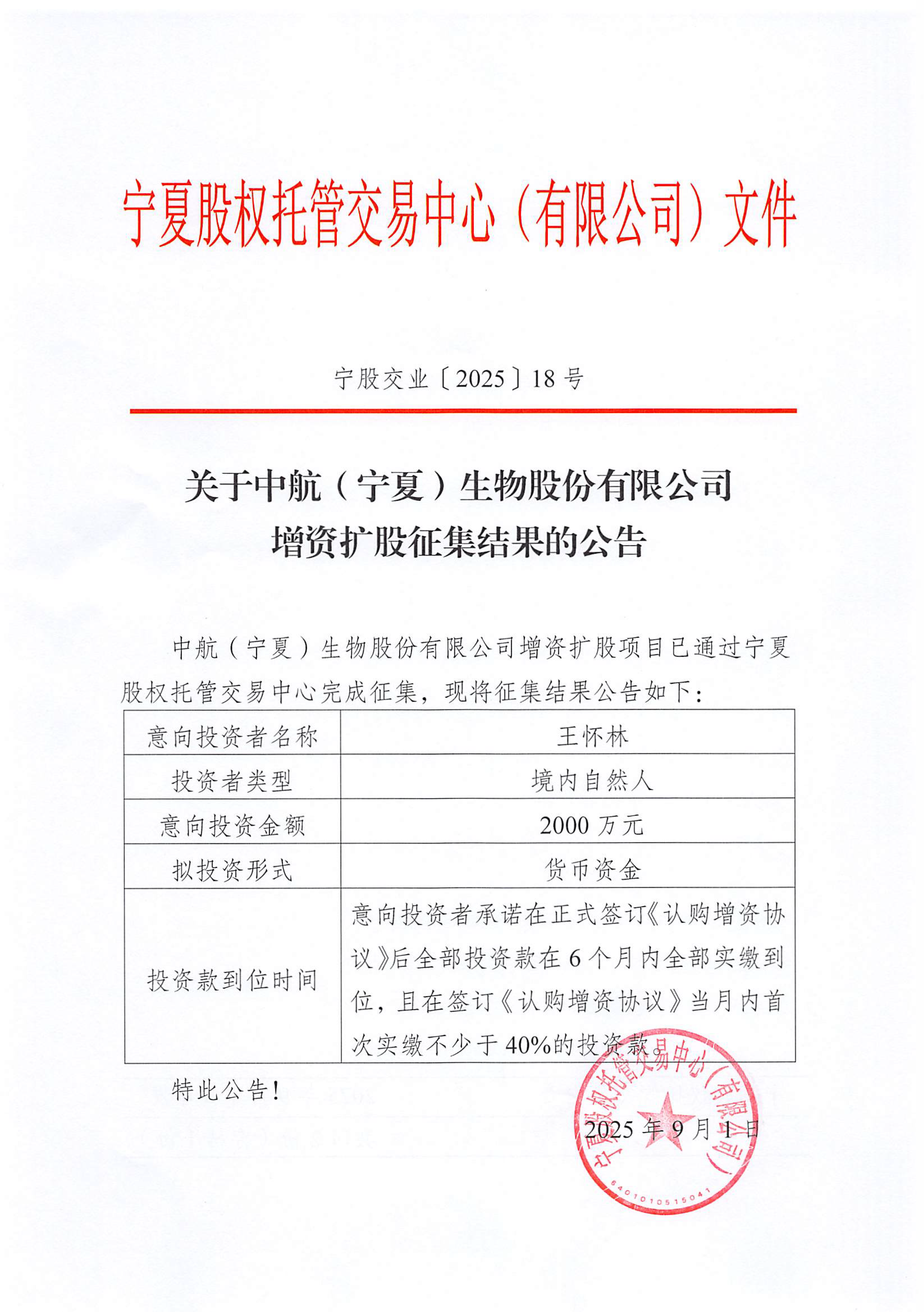 關(guān)于中航(寧夏)生物股份有限公司增資擴(kuò)股征集結(jié)果的公告